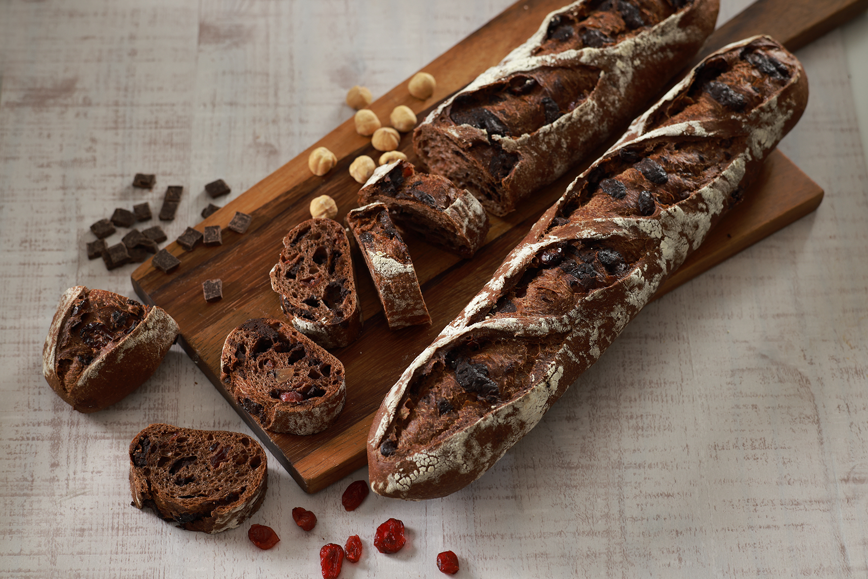 クーベルチュールチョコレートの入った、この時期限定のショコラ味のバゲットです。 濃厚なチョコレートの味わいとアクセントに加えたクランベリーの酸味、 ヘーゼルナッツの香ばしい食感が絶妙なこだわりの一品です。 家族や大切な人と過ごすバレンタインや、自分へのご褒美にぜひお楽しみください。